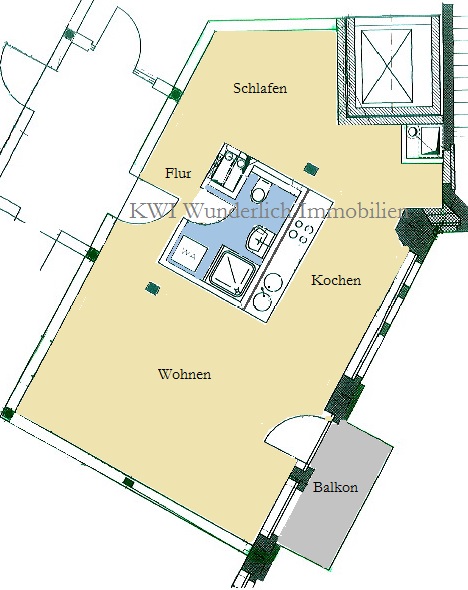 Sie suchen eine Loft mitten in der City? Und wollen gleichzeitig ruhig und fußläufig zu einem Park wohnen? Dann ist dieses Cityloft mit seinem offenem Grundriss genau das Richtige. Highlights sind natürlich der Balkon mit Blick zum ruhigen, begrünten Innenhof und die EBK. Wohnen, Kochen und Schlafen spielt sich alles in einem Raum ab - und doch liegt jeder Bereich für sich. Einzigst das Bad liegt separat. Es ist hochwertig gefliest, innenliegend und mit einer Dusche ausgestattet. Sie finden in der Wohnung geöltes Industrieparkett und an den Wänden Rauhfasertapete.